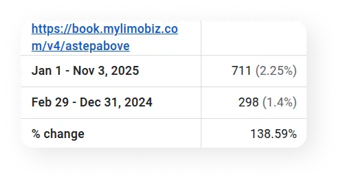 Having 32 keywords on the first page isn’t just a number, it’s the firm establishing authority, being seen where it matters most, and ensuring that every relevant search connects the right customer to their service. This level of visibility transforms interest into action, making it easier than ever for clients to choose a trusted limousine service in Charlotte.
