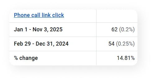 Phone clicks totaled 62 conversions, turning searches into immediate conversations and bookings