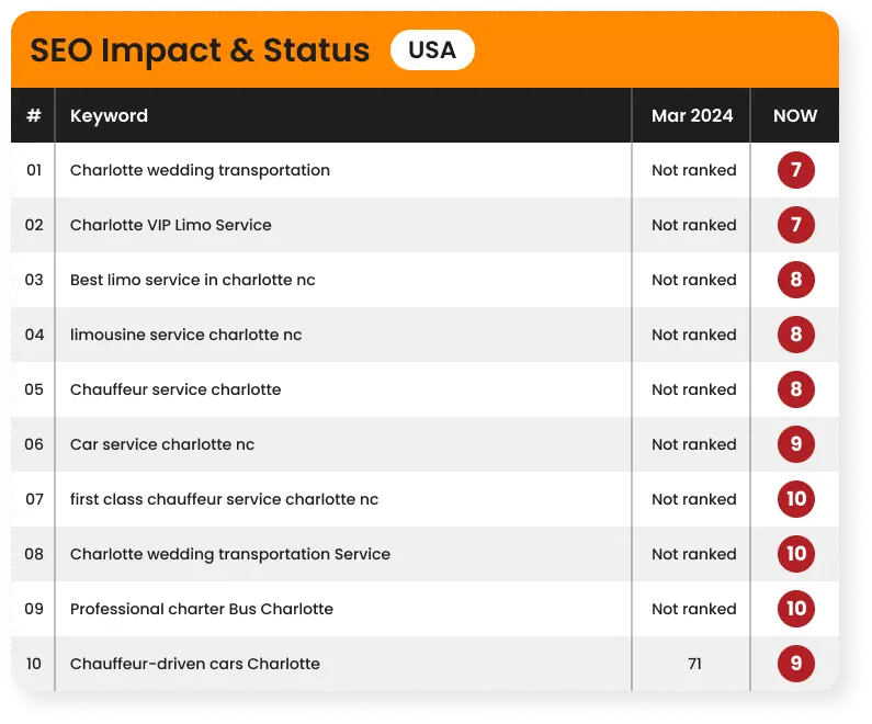 Our client's journey to online prominence reached a major milestone when every one of their targeted keywords secured a spot on the first page of Google. From searches for airport rides to luxury event transportation, potential customers no longer have to scroll through multiple pages to find them.